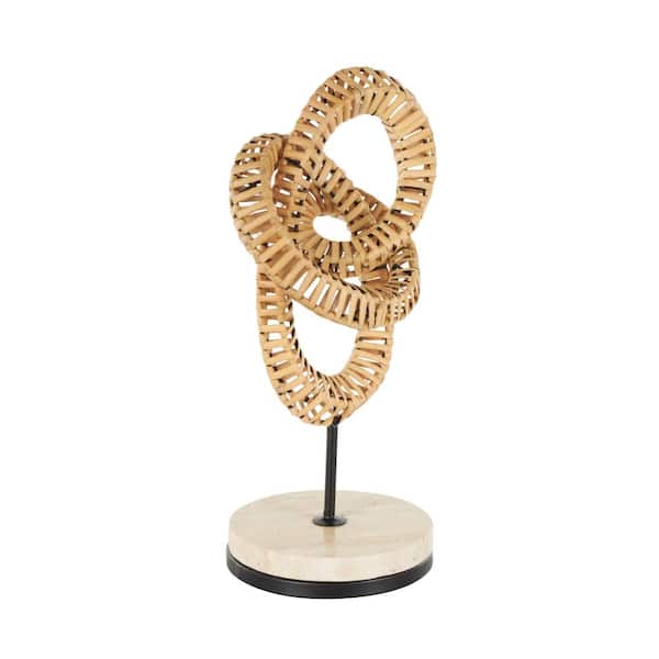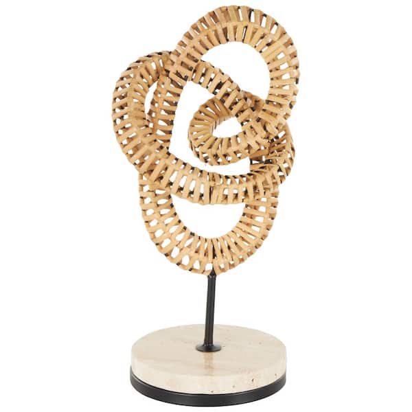 Brown Rattan Handmade Looped Abstract Sculpture with White Marble Base