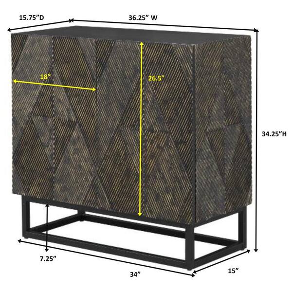 Brown Wooden 34 in. Layered Diamond 2 Door Geometric Cabinet with Gold Accents and Black Iron Base