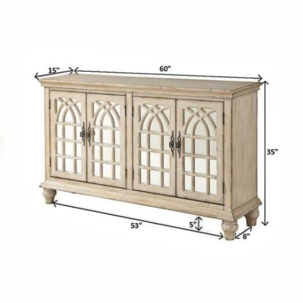 Cream Distressed Wood 60 in. x 35 in. 4-Door Sideboard with Mirrored Cathedral Fretwork and Bronze Scrolled Handles