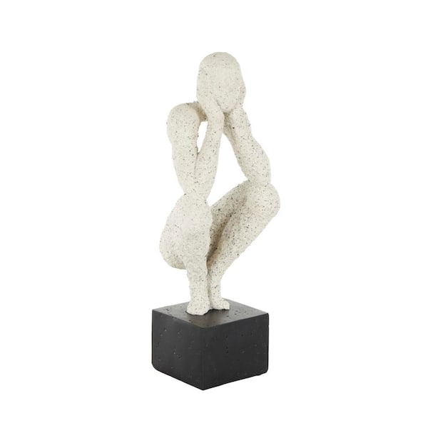 Cream Polystone Crouching People Sculpture with Black Square Base