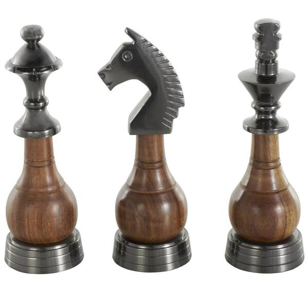 Dark Gray Aluminum Metal King, Queen, and Knight Chess Sculpture with Mango Wood Center Set of 3