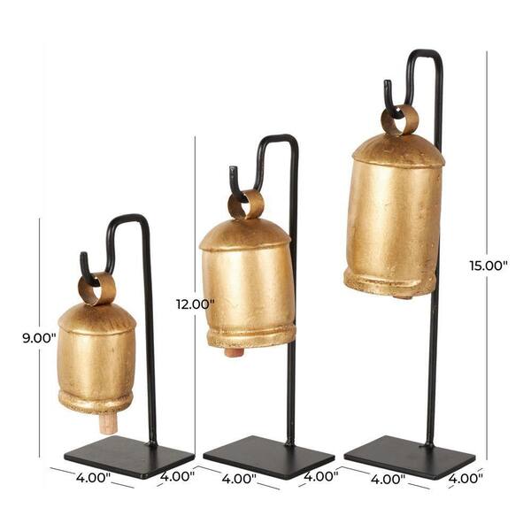 Gold 4 in. x 9 in. Bell Metal Sculpture with Black Stand and Brown Wooden Clapper (Set of 3)
