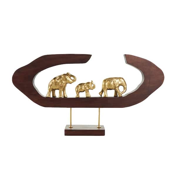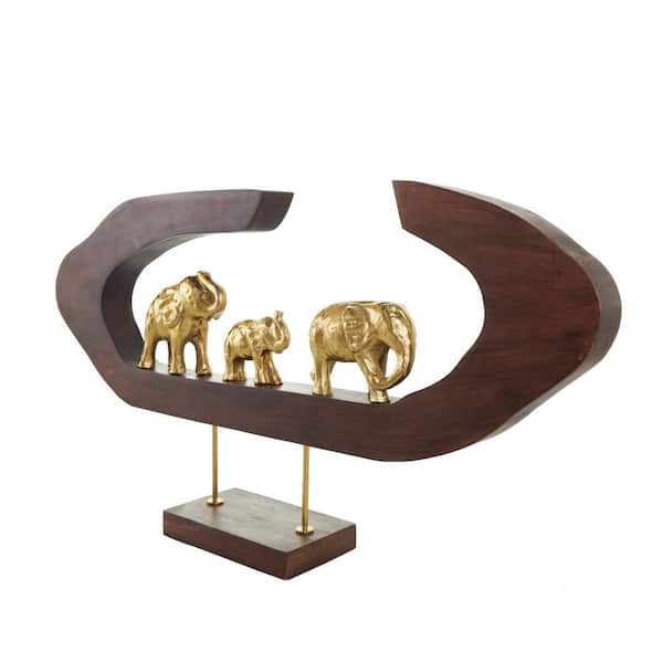 Gold Aluminum Metal Elephant Sculpture with Wooden Ring Frame