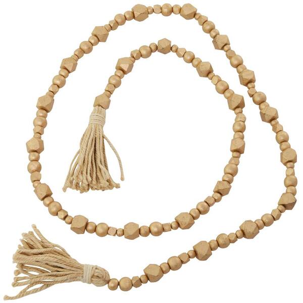 Gold Handmade Mango Wood Hexagon Metallic Carved Geometric Long Beaded Garland with Tassel