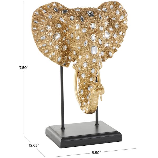 Gold Resin Beaded Elephant Sculpture with Rhinestone Accents and Black Metal Stand