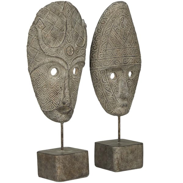 Gray Polystone Handmade Carved Mask Sculpture (Set of 2)