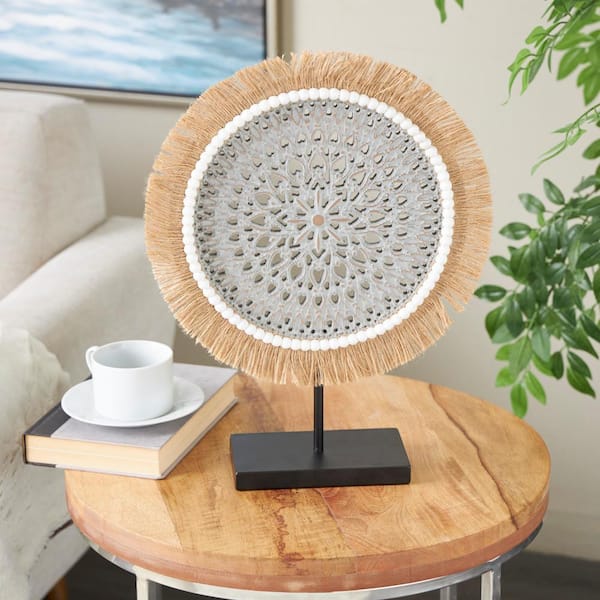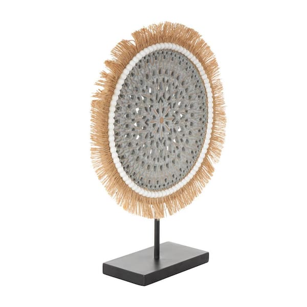 Gray Wooden Handmade Seagrass Fringed Tribal Sculpture with Black Base