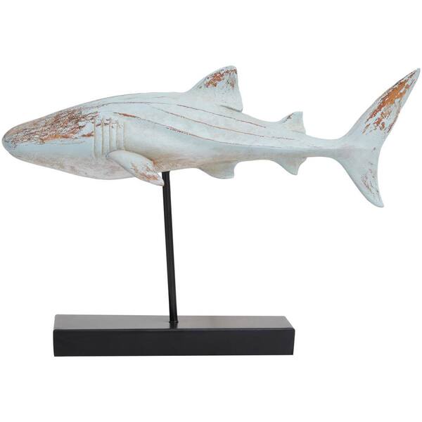 Light Blue Resin Carved Shark Sculpture with Wood Inspired Accents and Black Base