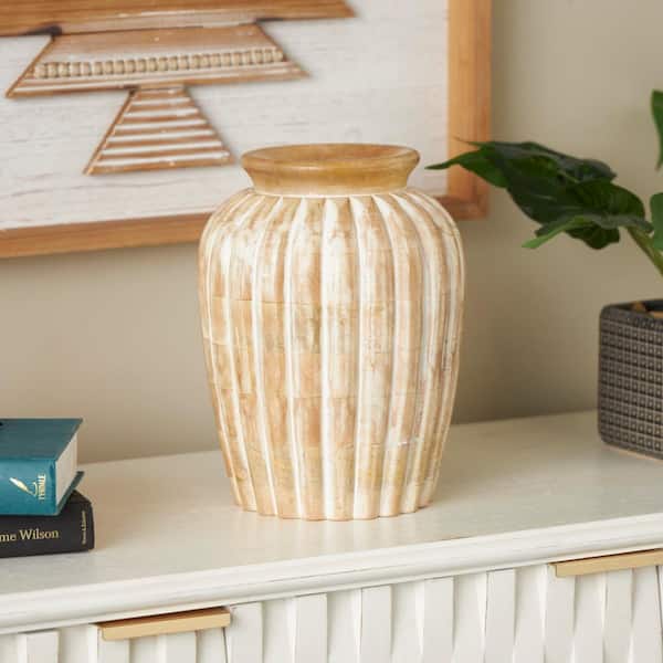 Light Brown Distressed Mango Wood Decorative Vase with Carved Ridges