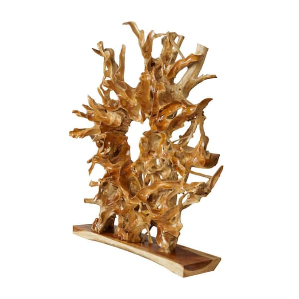 Light Brown Teak Wood Handmade Large Oversized Tree Root Floor Abstract Sculpture with Live Edge Teak Base