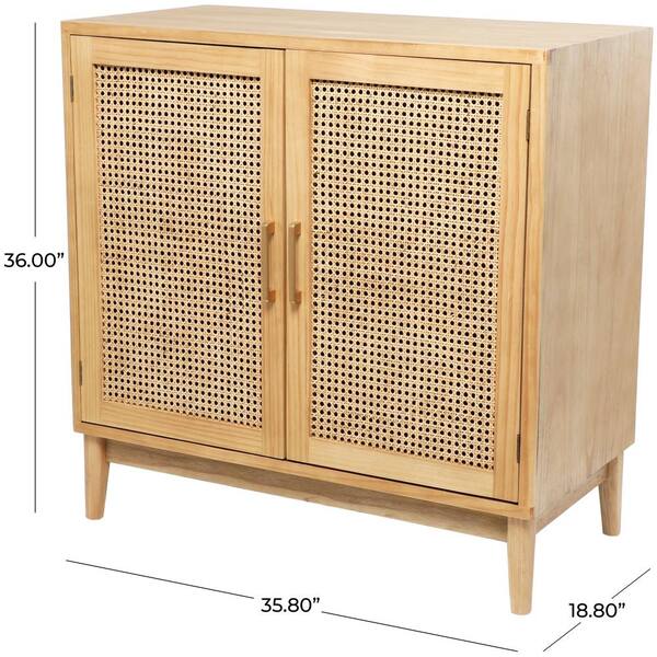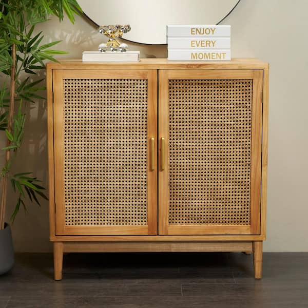 Light Brown Wood 1 Shelf and 2 Door Storage Cabinet with Cane Front Doors and Gold Handles