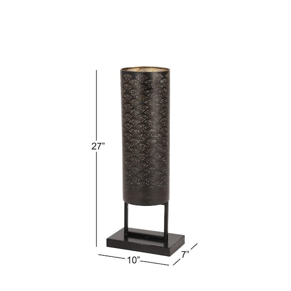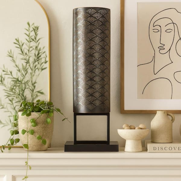Modern Style Large Black Cylinder Metal Lantern Candle with Pierced Metal Boho Pattern on Metal Base