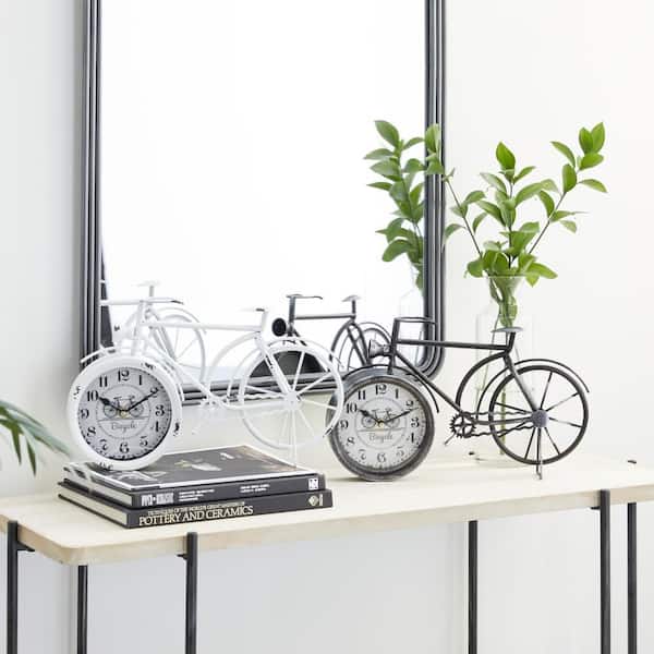 • Black tabletop analog clocks come as a set of 2