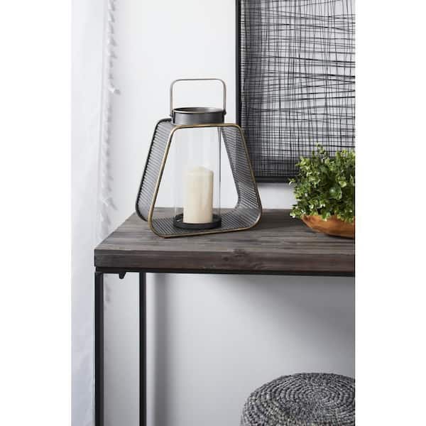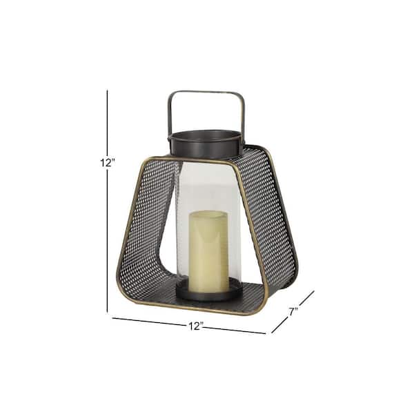 Rounded Triangle Black Metal Lantern Candle Holder with Handle and Gold Trim