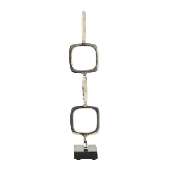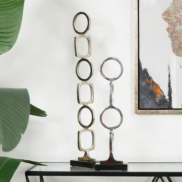 Silver Aluminum Stacked Geometric Rings Abstract Sculpture with Black Marble Bases (Set of 2)