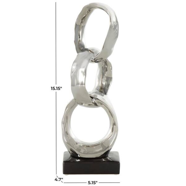Silver Ceramic Interlocked Rings Abstract Sculpture with Black Base