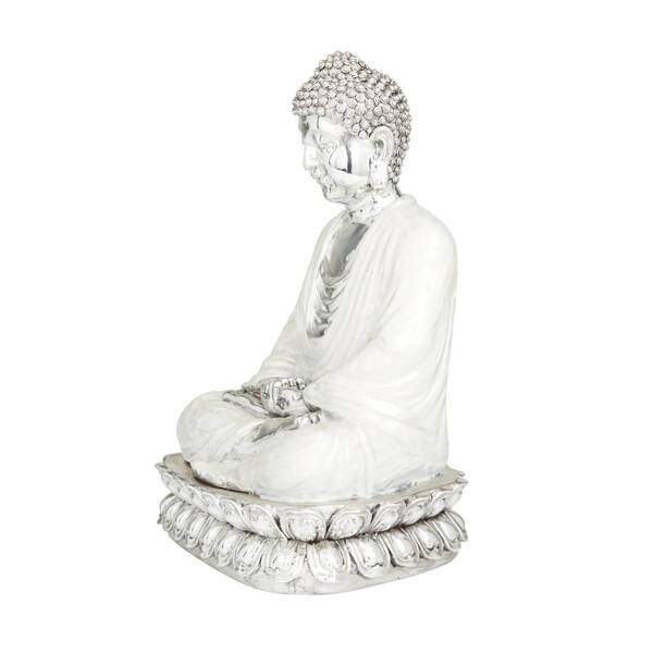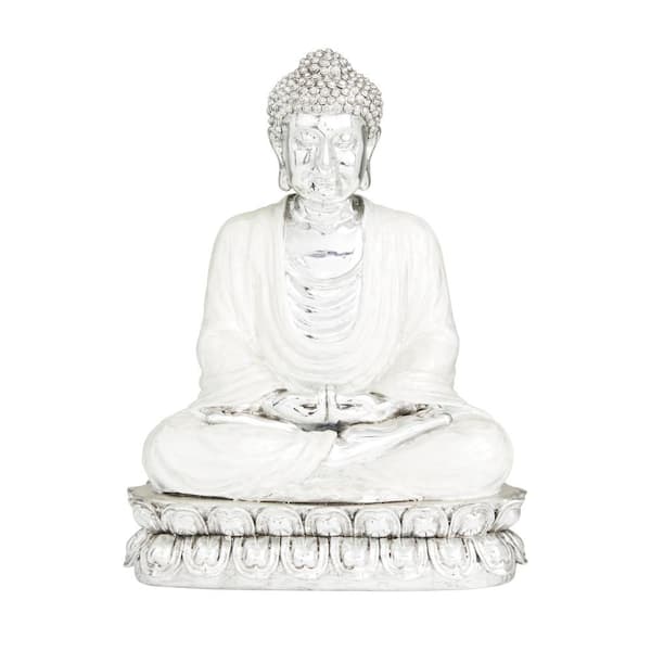 Silver Polystone Meditating Buddha Sculpture with Engraved Carvings and Relief Detailing