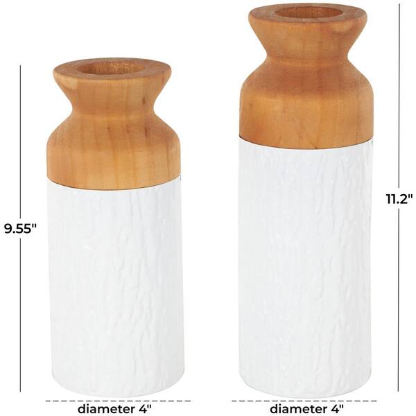 White Abstract Textured Color Block Metal Decorative Vase with Brown Wood Tops (Pair of 2)
