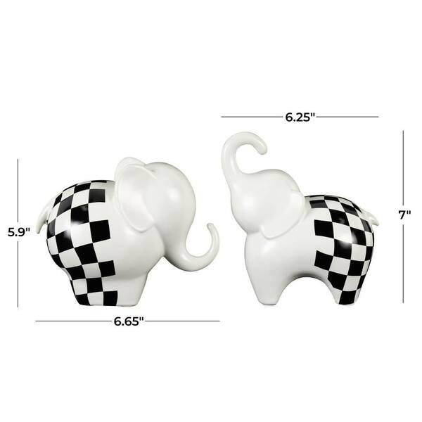 White Ceramic Small Elephant Sculpture with Checkered Pattern (Set of 2)