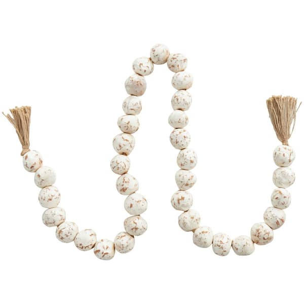 White Handmade Ceramic Round Intricately Shaped Large Distressed Beaded Garland with Tassel