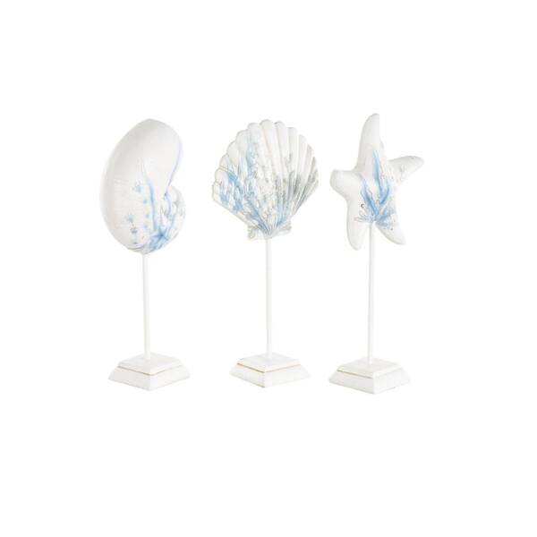 White Poly Stone Shell and Starfish Sea Life Sculpture with Blue Coral Patterns (Set of 3)
