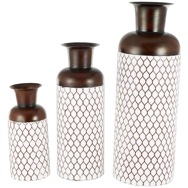 White Tall Trellis Floor Metal Decorative Vase with Brown Trumpet Tops Set of 3