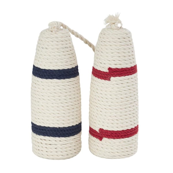 White Wood Handmade Coiled Striped Rope Buoy Sculpture with Joined Hanging Handle (Set of 2)