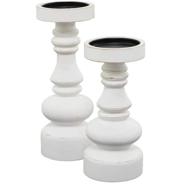 White Wood Turned Style Pillar Candle Holder (Set of 2)