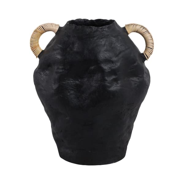 13 in. Black Terra Cotta Amphora Decorative Vase with Rattan Handles