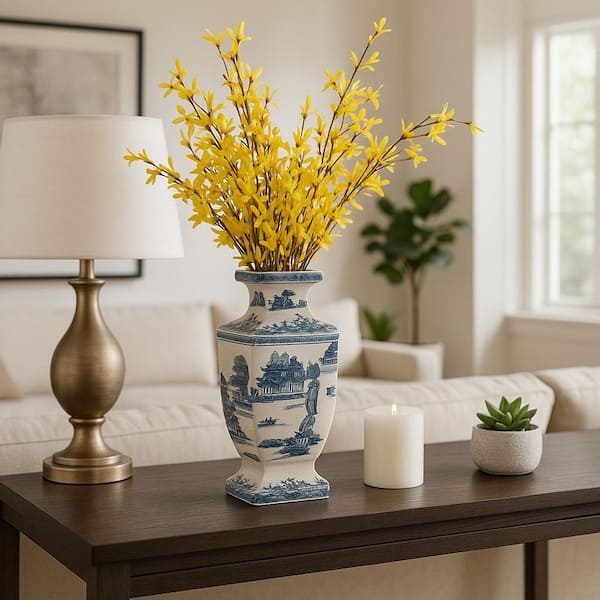 15 in. Blue and White Ceramic Chinoiserie Floral Vase