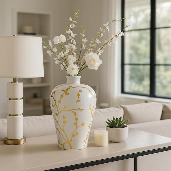 • White ceramic vase with gold decal adds a chic look