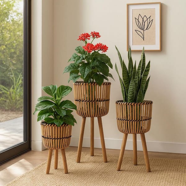 15 in. x 26 in. Natural Bamboo Footed Planters Decorative Pots (Set of 3)