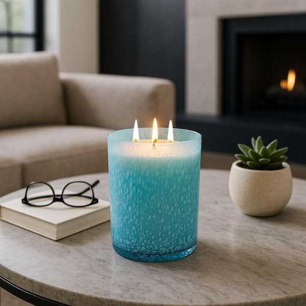 8.5 in. Blue Glass Woodsy Sage and Sea Salt Speckle Candle 105 Oz