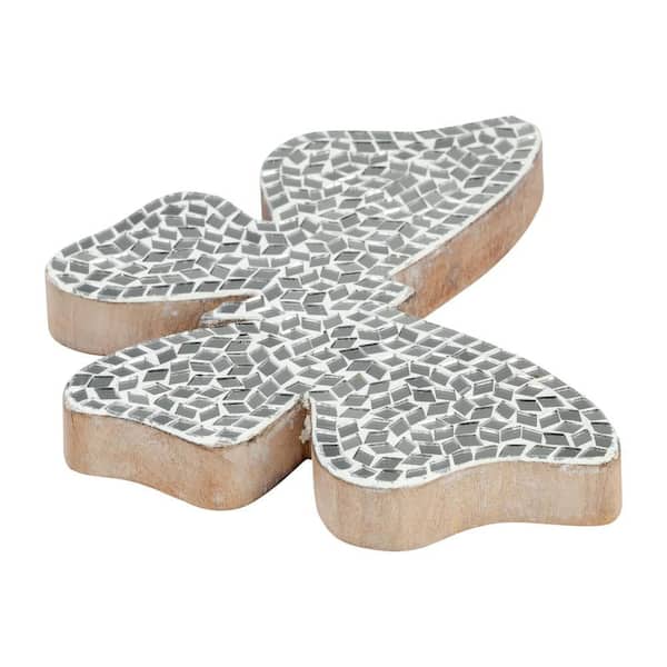 8 in. x 7 in. White Mango Wood and Glass Butterfly Figurine with Intricate Mosaic Detailing