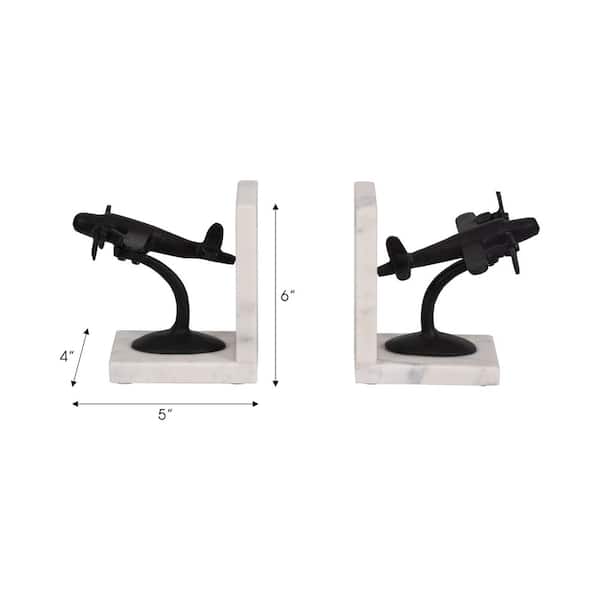 Black 6 in. Metal Novelty Airplane Bookends On Marble (Set of 2)