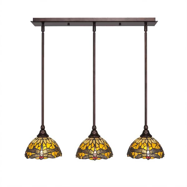 Livingston 100-Watt 3 Light Bronze, Linear Pendant Light with 7 in. Dragonfly Art Glass Glass Shades No Bulbs Included