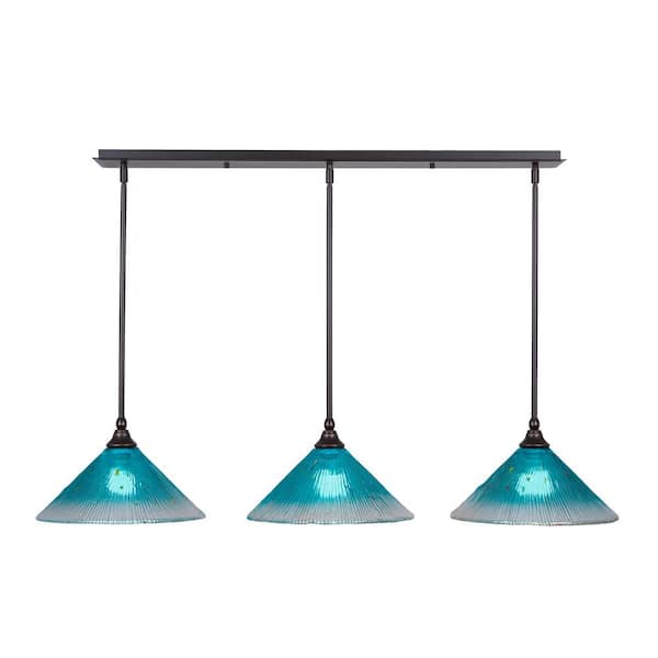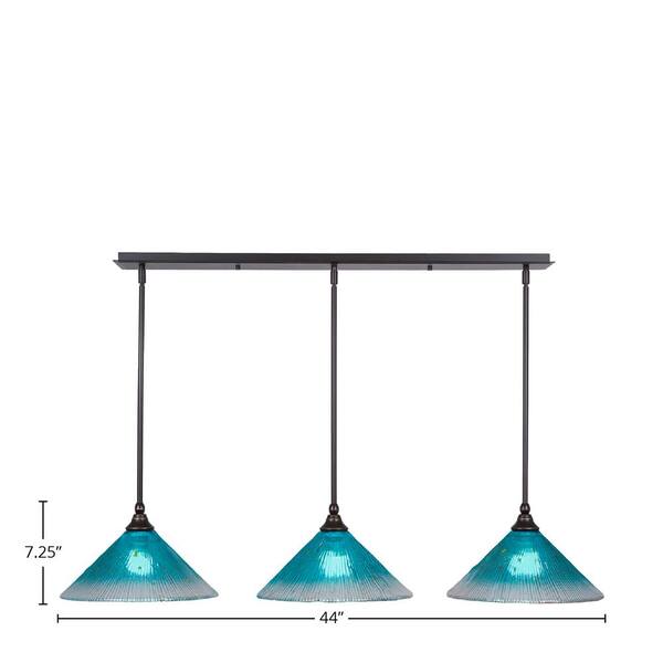 Livingston 100-Watt 3 Light Dark Granite Linear Pendant Light with 12 in. Teal Crystal Glass Shades No Bulbs Included