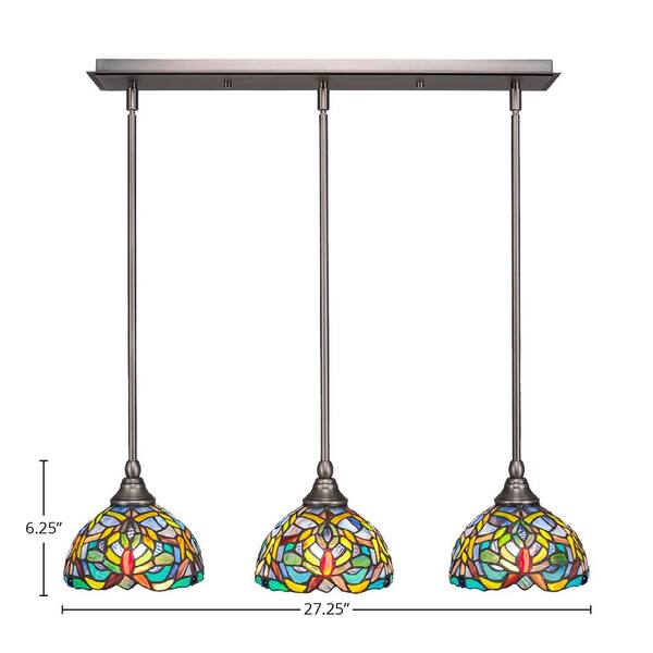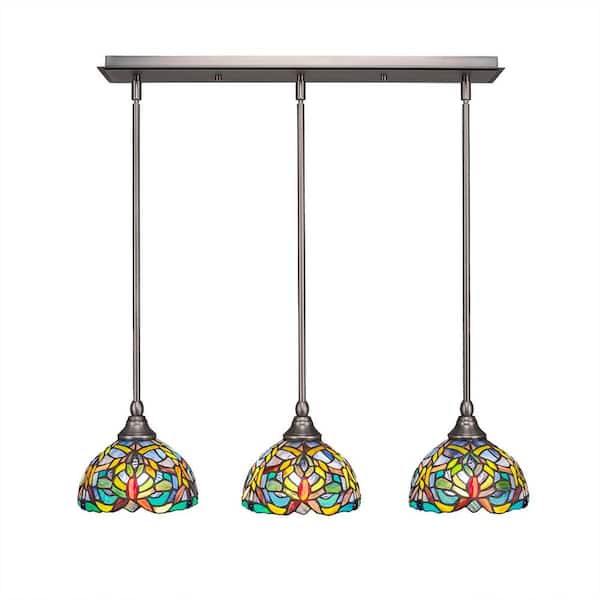Livingston 100-Watt 3 Light Nickel, Linear Pendant Light with 7 in. Kaleidoscope Art Glass Shade, No Bulbs Included