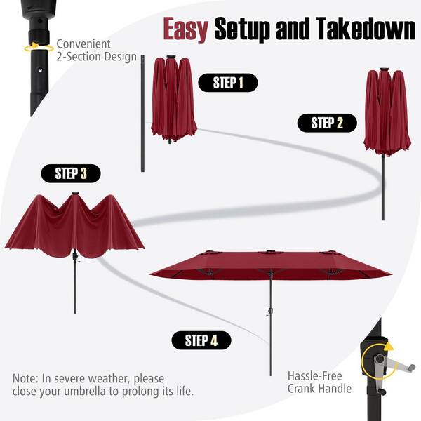15.5 ft. Steel Extra-Large Market Patio Umbrella in Wine with LED Solar Lights and Crank Handle(Stand Not Included)