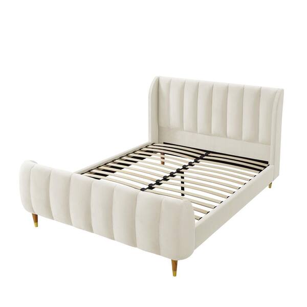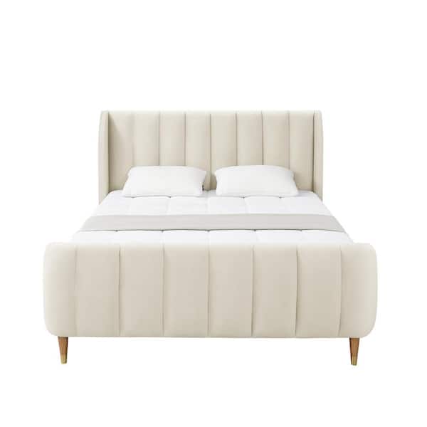 Eleazer Beige King Size Platform Bed Upholstered Velvet
