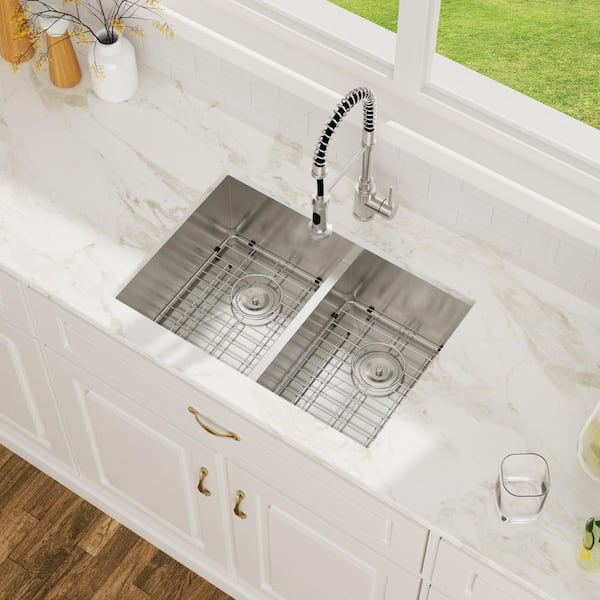 30 in. Undermount Sink Double Bowl 50/50 16-Gauge Brushed Stainless Steel Kitchen Sink with Low Divide