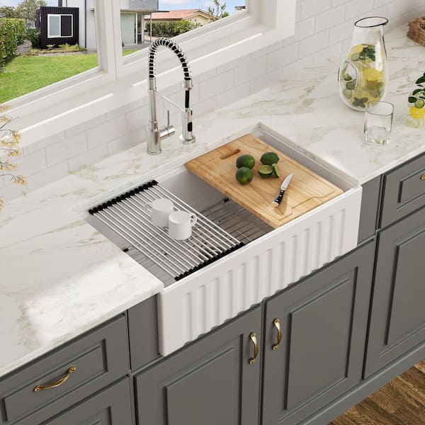 33 in. Fireclay Undermount Workstation Sink Single Bowl Glossy White Kitchen Sink
