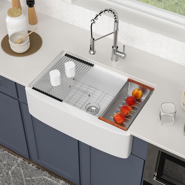 33 in. x 20 in. x 10 in. Farmhouse Apron-Front Kitchen Sink Single Bowl Workstation White Fireclay Sink with Accessories