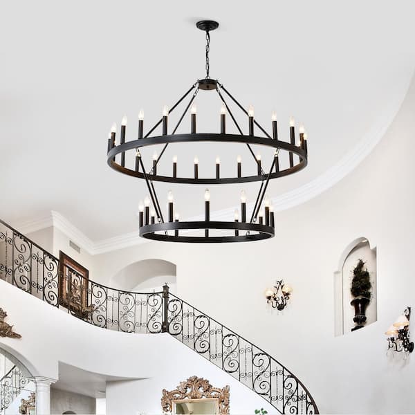 36-Light 2-Tier Matte Black Wagon Wheel Chandelier for Living Room with E12 Sockets, no Bulb Included