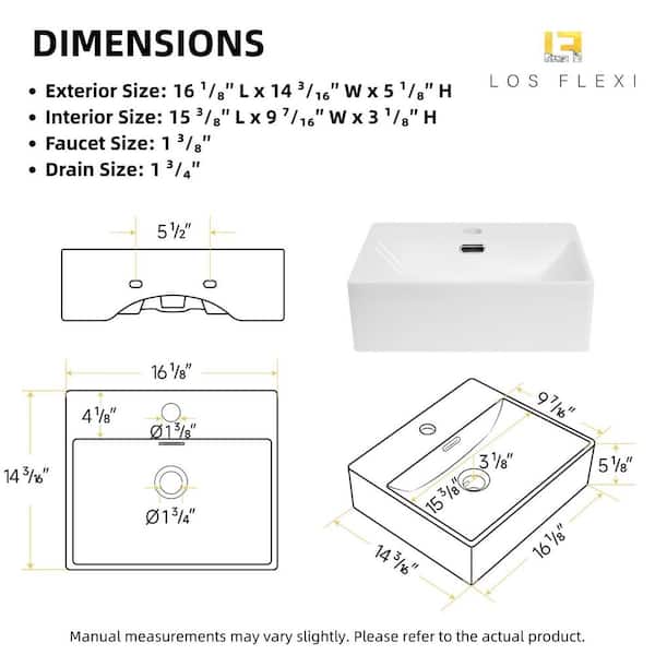 16 in. x 14 in. Wall Mounted Vessel Sink with Overflow, White Rectangular Ceramic Sink with One Faucet Hole