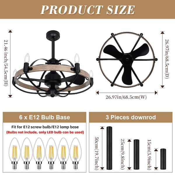 27 in. Indoor Black Farmhouse Style Chandelier Ceiling Fan with Light and Remote Control, Bladeless Motor for Bedroom