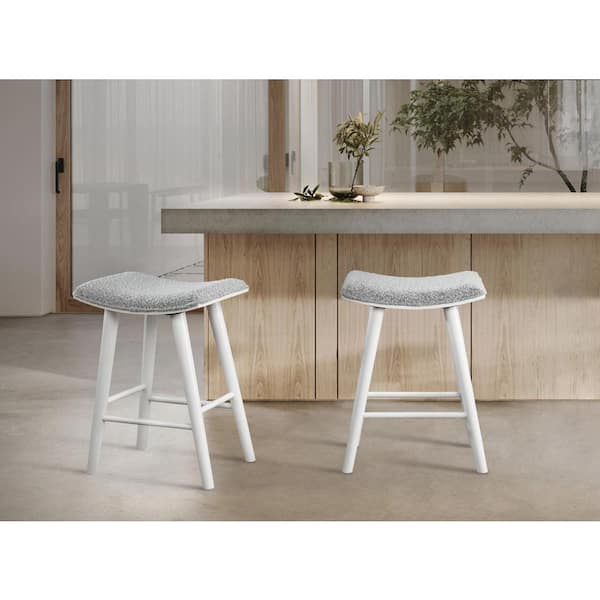 Luna 24 in. White Backless Wood Saddle Counter Stools with Gray Boucle Fabric Seat (Set of 2)