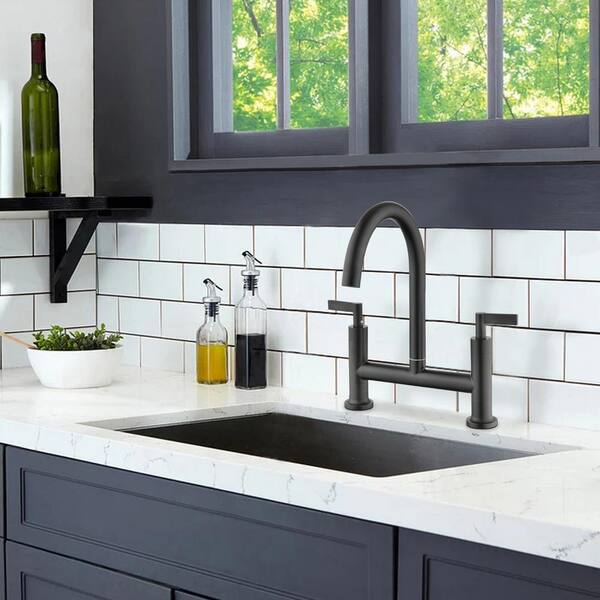 Double Handle High-Arc Bridge Kitchen Faucet in Matte Black Finish Stainless Steel Corrosion Resistant w/Bubbler Aerator