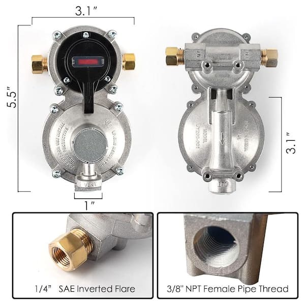 Dual Tank 2-Stage Auto Changeover LP Propane Regulator with Gauge and 2x18 Pigtail Hoses for RVs and Campers Silver