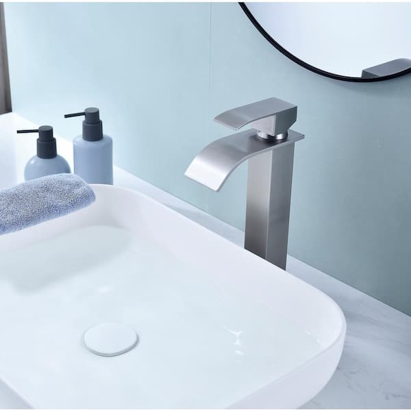 Single Handle Single Hole Bathroom Faucet with Pop-Up Drain Waterfall Spout Bathroom Sink Faucet in Brushed Nickel